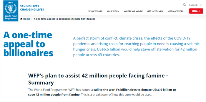 根据联合国世界粮食计划署公布的名为《对亿万富翁的一次恳求》的援助计划,在66亿美元的捐款中,将有35亿美元用于粮食及其运输,20亿美元用于发放现金和食品券,7亿美元用于具体国家的特定成本,4亿美元用于全球和区域业务管理、行政和问责。