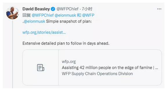 随后,戴维•比斯利又发了一条推文,贴出WFP官网上刊载的“帮助4200万处于饥荒边缘的人”计划概要链接,并再次@马斯克。