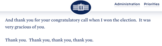 发言最后,拜登还对他当选美国总统时习主席发来的贺电致谢,并连说了四声“谢谢”作为发言结尾。
