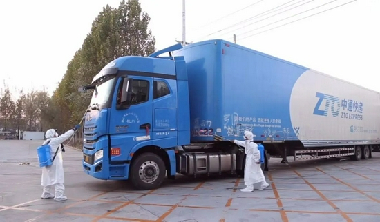 经过两次消毒的包裹快件将被放入不同网点的车辆,运到网点后再派送到消费者手中。此外,办公区、宿舍区、食堂都会每天定时进行两次生产生活环境消杀。