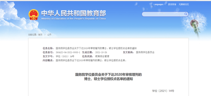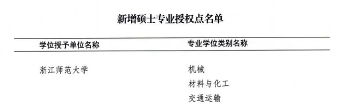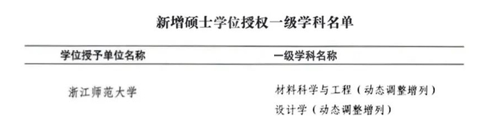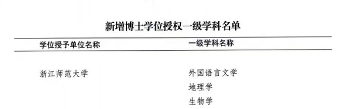 来源:浙江师范大学近日,国务院学位委员会下发了《关于下达2020年审核增列的博士、硕士学位授权点名单的通知》(学位〔2021〕14号)和《关于下达2020年动态调整撤销和增列的学位授权点名单的通知》(学位〔2021〕15号),浙师大增列外国语言文学、地理学、生物学3个一级学科博士学位授权点,机械、材料与化工、交通运输3个硕士专业学位授权点;通过动态调整增列材料科学与工程、设计学2个一级学科硕士学位授权点。