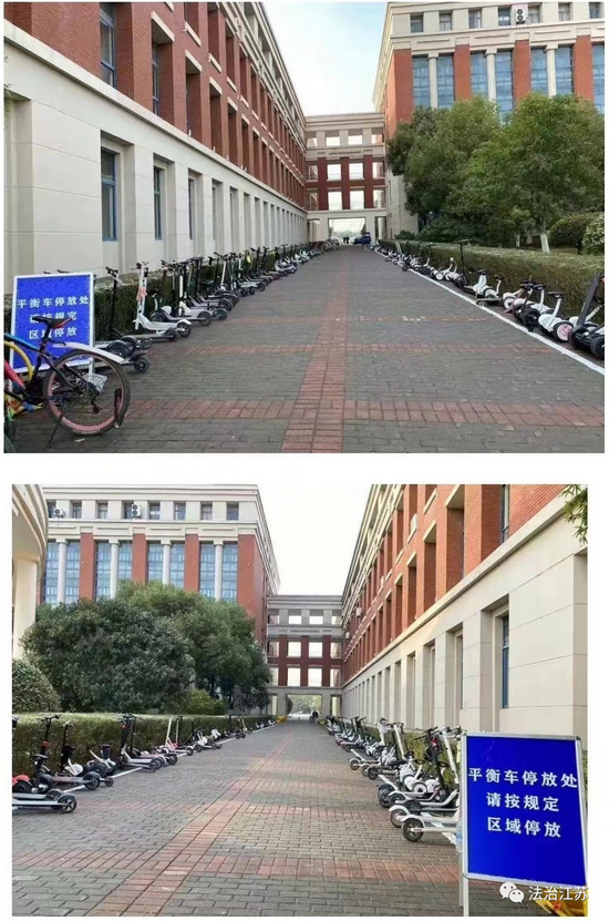 南京传媒学院党委宣传部相关负责人介绍,学校在教学楼、图书馆、餐厅等门口都开辟了“迷你停车位”,供学生停放平衡车。