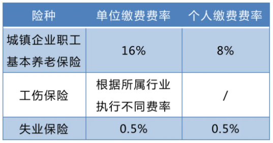 1、随用人单位参保的,缴纳城镇企业职工基本养老保险、工伤保险、失业保险比例按各险种现行政策执行,具体如下: