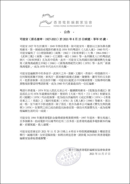 (观察者网讯)11月18日,香港电影编剧家协会于其社交媒体账号发布公告称,知名编剧司徒安(原名曾坤 1927-2021)于2021年8月23日病逝,享年95岁。
