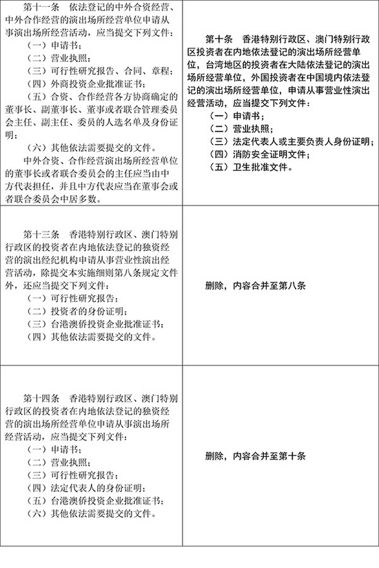 将《细则》原第十条、第十三至十五条中,香港特别行政区、澳门特别行政区的投资者在内地依法登记的演出经纪机构和演出场所经营单位,台湾地区的投资者在大陆依法登记的演出经纪机构和演出场所经营单位,外国投资者在中国境内依法登记的演出经纪机构和演出场所经营单位,申请从事营业性演出经营活动,需要提交的文件有关规定,分别合并至修订后的第八条和第十条。