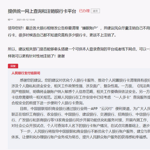 今年5月,有网友在人民网“领导留言板”上留言表示,当下各大银行建议民众注销不使用的银行卡,但很多人忘记自己有多少张银行卡,因此希望搭建可供本人登录查询的平台或线下网点,一次性查询、注销银行卡。11月18日,人民银行支付结算司回应称,已经在工作安排中考虑“一人多卡”查询服务提供问题。