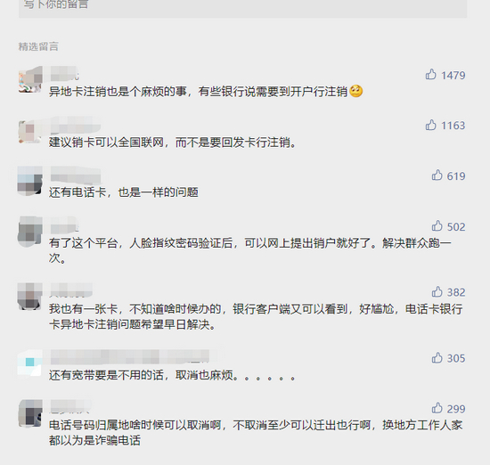 在央行回应“一人多卡”查询服务相关新闻的下方,不少网友留言点赞,也有人表示,银行卡异地注销也是个麻烦的事,有些银行说需要到开户行注销。此外,宽带取消也面临类似问题。