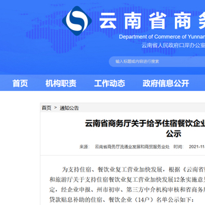 2020年3月,云南省财政厅联合云南省商务厅、云南省文化和旅游厅出台《关于支持住宿餐饮业复工营业加快发展12条实施意见》(简称《实施意见》),采取贴息、担保、补助等方式,支持住宿、餐饮企业减轻成本压力,尽快复工运营,加快高质量发展。