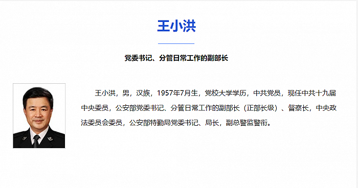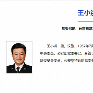 2018年3月,公安部官网“领导信息”一栏显示,王小洪职务为公安部党委副书记、分管日常工作的副部长(正部长级),北京市政府党组成员、市公安局党委书记、局长。