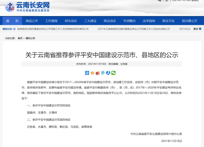 根据平安中国建设协调小组关于2017—2020年度平安中国建设示范市、县创建工作安排,由各州(市)对照平安中国建设示范市、县申报评选条件,自愿向省委平安办提出申请。省委平安办根据各州(市)、县(市、区)2017年—2020年平安建设考评综合成绩,择优确定了参评平安中国建设示范市、县的地区。现按照申报评选程序予以公示,公示时间为2021年11月18日至24日,具体名单如下: