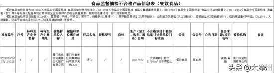 厦门市味友闽南宴文化推广有限公司的汤勺(消毒日期为2021年9月2日),大肠菌群不合格,检验机构为厦门泓益检测有限公司;