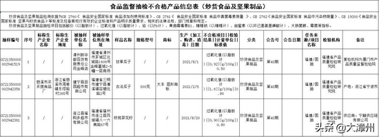 漳州新华都百货有限责任公司金峰店销售的甘草瓜子(生产日期为2021年8月1日),过氧化值(以脂肪计)不合格,初检机构为福建省产品质量检验研究院,复检机构为厦门市产品质量监督检验院;