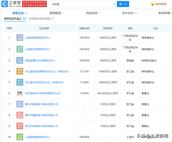 通过企查查了解到,朱宸慧(雪梨Cherie)共关联16家企业,其中在13家企业里担任法定代表人职务,企业所涉营销策划、投资、电子商务等领域。