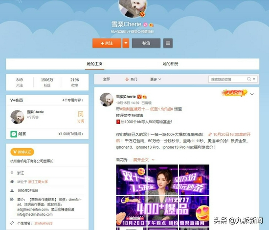 九派新闻注意到,朱宸慧(雪梨Cherie)的微博认证为“杭州宸帆电子商务公司董事长”,有超1500万粉丝,出生年月显示1990年2月8日。