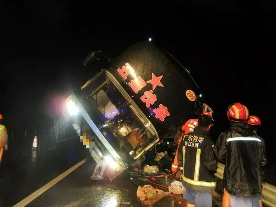12时55分许,行驶至惠州市境内广河高速公路龙门段73公里440米处时,车辆失控向左偏离行驶方向,与公路中央分隔带护栏发生刮撞后旋转,并掉头仰翻于中央分隔带上,造成客车上19人当场死亡、31人受伤,中央分隔带护栏及车辆损毁。