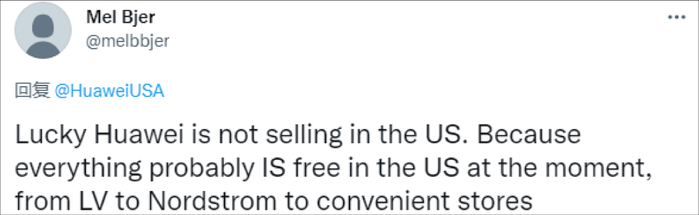 可以说,华为美国官推这条推文包含了三个梗,一是黑五购物节,二是美国正在发生的“零元购”,三是美国政府无端打压华为。