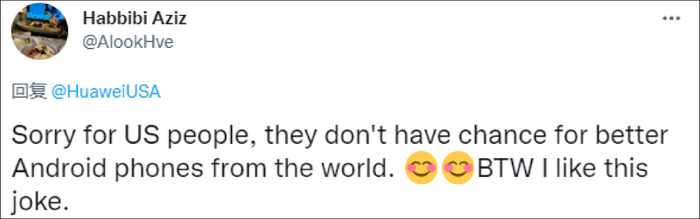 随后,华为美国官推号又发了一条推文,表示自己是在开玩笑。