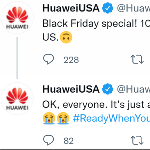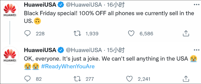 美国购物节“黑色星期五”(2021年11月26日)来临在即,华为美国的官方推特号@HuaweiUSA 突然皮了一下。