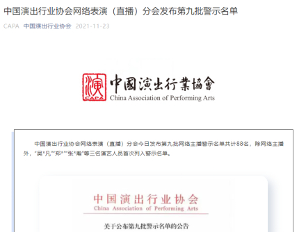 在此背景下,中央宣传部、文化和旅游部今年以来重拳整治文娱领域乱象,严厉打击演艺人员违法失德行为。根据国家文娱领域综合治理禁止违法失德艺人转移阵地复出相关精神,相关会员企业及时主动向中国演出行业协会网络表演(直播)分会报送有关违法失德艺人账号信息,分会组织内容评议委员会进行评议,最终决定首次将违法失德艺人纳入网络主播警示名单中。