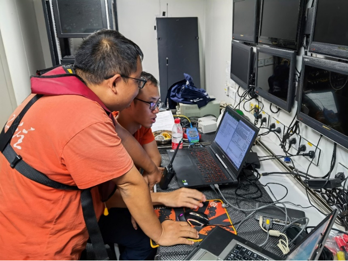 “悟空号”实现独立畅游海底的背后,是团队成员坚持不懈、精益求精、共同努力的结果。为确保“悟空号”第二天按时下潜并实现长距离高速水声通信,张文博和纪晓峰通宵对声呐吊阵电子舱的软件及硬件进行完善升级。