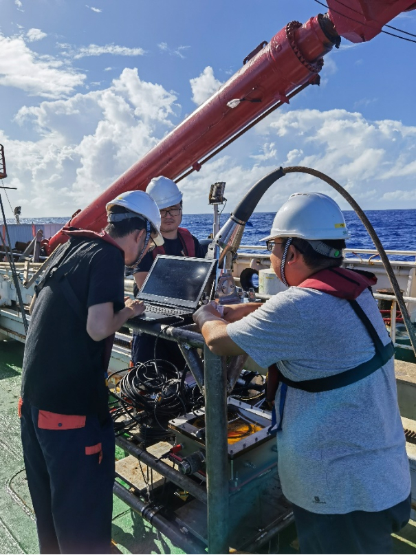 李岳明副教授在驾驶台,通过我校研发的全海深USBL时刻关注“ 悟空号”AUV的位置与深度。曹建、张文博、纪晓峰与实验部人员布放声呐吊阵,建立水声通信链路。