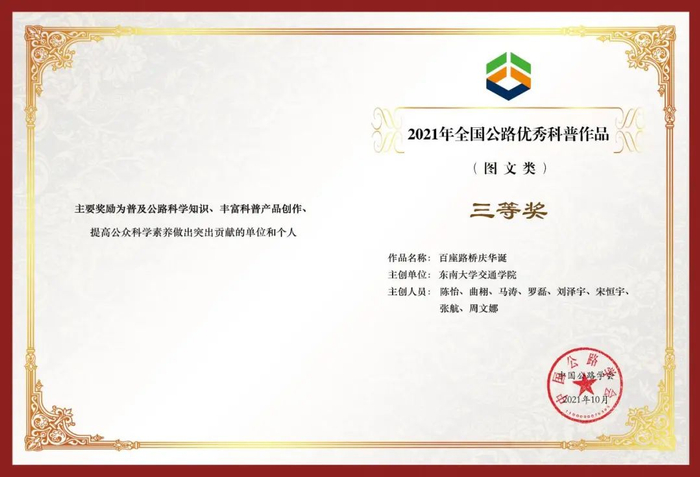 此作品以建党百年间我国路桥事业的发展为切入点,搜集整理了一百座具有革命血液、红色基因、时代意义的红色路桥,制作红色路桥科普海报和科普折页,并组织红色路桥科普展览。