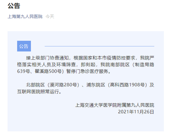 据上海第九人民医院公众号消息,接上级部门协查通知,根据国家和本市疫情防控要求,我院严格落实相关人员及环境筛查,即刻起,我院南部院区(制造局路639号、瞿溪路500号)暂停门急诊医疗服务。北部院区(漠河路280号)、浦东院区(高科西路1908号)及互联网医院照常运行。