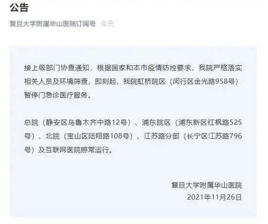 复旦大学附属华山医院今天早上,发布公告,接上级部门协查通知,根据国家和本市疫情防控要求,我院严格落实相关人员及环境筛查,即刻起,我院虹桥院区(闵行区金光路958号)暂停门急诊医疗服务。总院(静安区乌鲁木齐中路12号)、浦东院区(浦东新区红枫路525号)、北院(宝山区陆翔路108号)、江苏路分部(长宁区江苏路796号)及互联网医院照常运行。