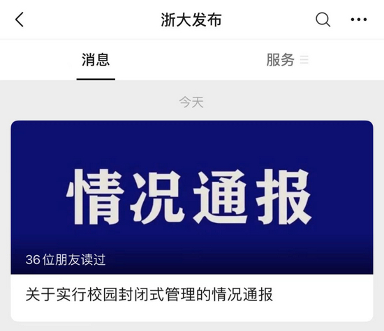 11月25日,微信公号“浙大发布”发布《关于实行校园封闭式管理的情况通报》。