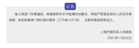 普陀区人民医院也在今早发布公告称,接上级部门协查通知,根据国家和本市疫情防控要求,我院严格落实相关人员及环境筛查,即刻起暂停门急诊医疗服务(江宁路1291号),互联网医院照常运行。