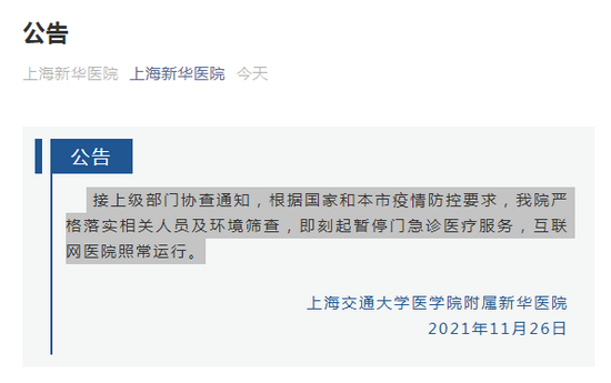 据新华医院官方微信号消息, 接上级部门协查通知,根据国家和本市疫情防控要求,我院严格落实相关人员及环境筛查,即刻起暂停门急诊医疗服务,互联网医院照常运行。