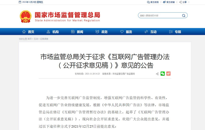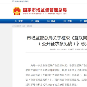 为进一步完善互联网广告监管制度,增强互联网广告监管的科学性、有效性,促进互联网广告业持续健康发展,根据《中华人民共和国广告法》等法律,市场监管总局在修订《互联网广告管理暂行办法》的基础上,起草了《互联网广告管理办法(公开征求意见稿)》,现向社会公开征求意见。欢迎广大公众提出意见,并通过以下途径和方式于2021年12月25日前提出意见:
