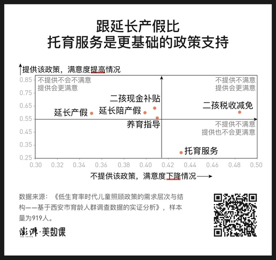 一份2021年发表在《人口研究》上的论文基于陕西省西安市919份问卷调查,归纳出育龄人群对于包括托育服务、二孩税收减免、二孩现金补贴、延长产假、延长陪产假、养育指导在内的多种政策偏好。