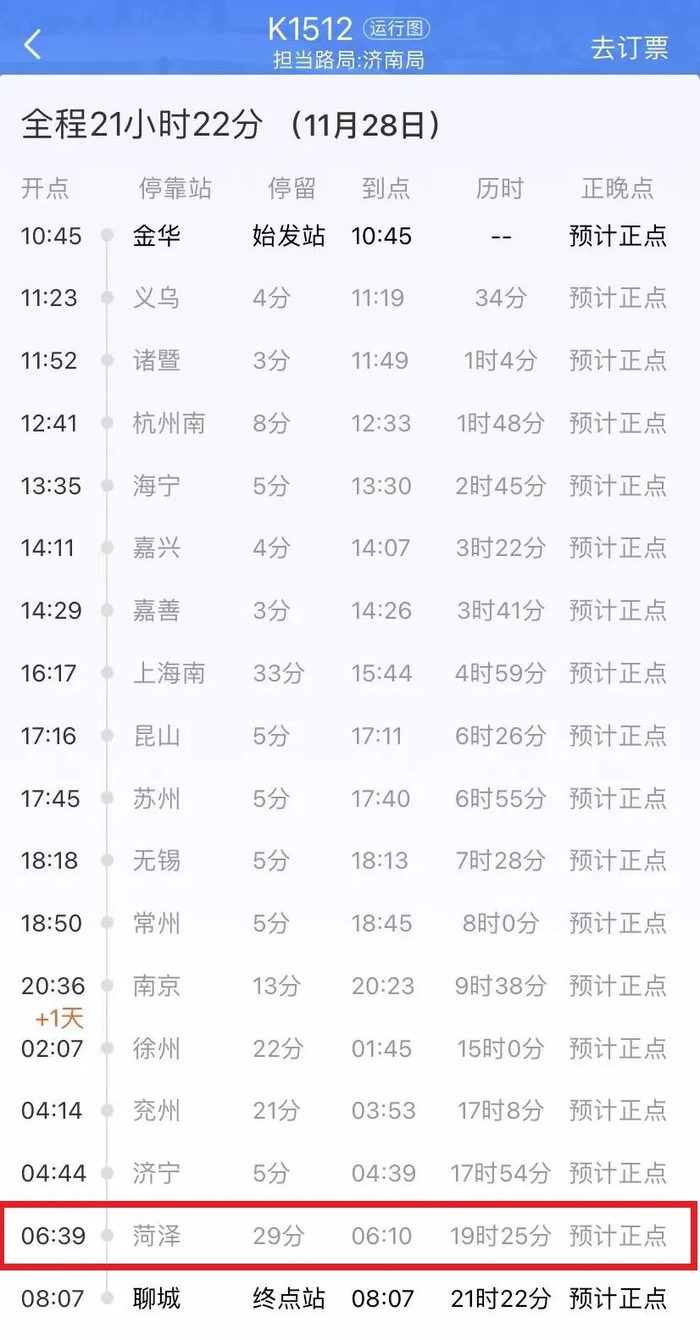 经在中国铁路12306官网查询,K1512次列车10:45从金华出发,次日到聊城,全程共有18个停靠站,其中包括菏泽。