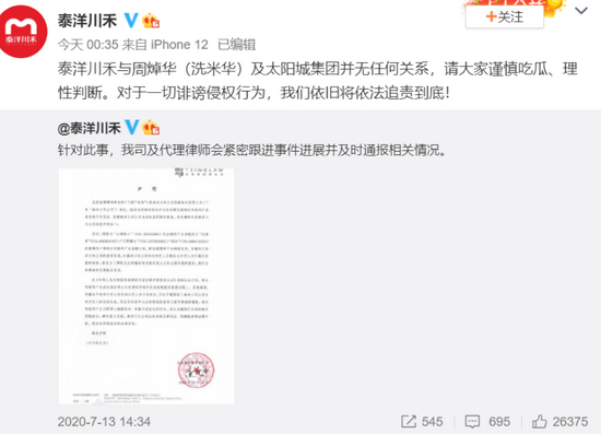 去年7月13日,泰洋川禾官方微博曾发声明称,公司始终坚持一个中国原则,反对一切分裂祖国的行径,也从未参与任何洗钱活动。11月27日凌晨,泰洋川禾官微转发了去年7月的另外一份相关声明,表示公司和洗米华太阳集团无任何关系,对于一切诽谤侵权行为,依旧将依法追责到底!