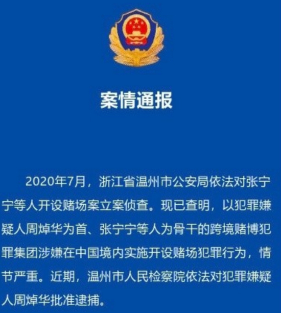 此外,以周焯华为首的跨境赌博犯罪集团骨干成员张宁宁等人因涉嫌开设赌场罪等罪名,已由温州市人民检察院依法提起公诉。