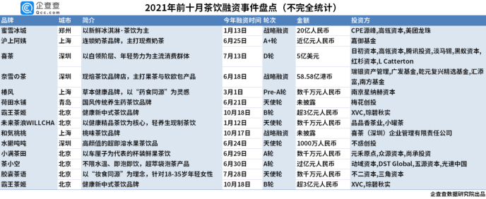 企查查数据显示,前十月蜜雪冰城、奈雪的茶、喜茶、沪上阿姨等较为知名的奶茶品牌获得融资,其中奈雪的茶获得58.58亿港元的战略投资,并于6月30日赴港上市;喜茶完成5亿美元的D轮融资;蜜雪冰城年初获得20亿元的战略投资,投资者有高瓴资本、美团龙珠等,并宣布启动A股IPO;沪上阿姨获得了一笔近亿元的A+轮融资,资本市场对知名品牌仍然信心十足。