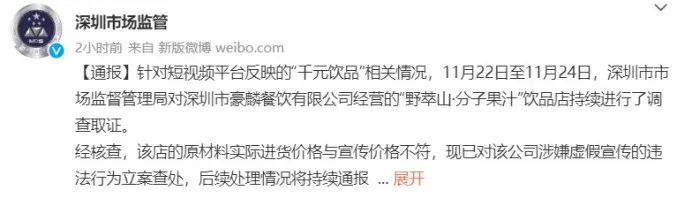 深圳市场监管微博 26日发布针对短视频平台反映的“千元饮品”相关情况,11月22日至11月24日,深圳市市场监督管理局对深圳市豪麟餐饮有限公司经营的“野萃山·分子果汁”饮品店持续进行了调查取证。经核查,该店的原材料实际进货价格与宣传价格不符,现已对该公司涉嫌虚假宣传的违法行为立案查处,后续处理情况将持续通报。