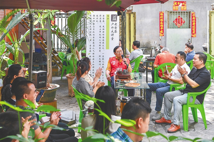 11月23日上午,海口市琼山区云龙镇长泰村冯白驹故居景点传出阵阵掌声,人们坐在大榕树底下,听新时代文明实践志愿者、退休老党员薛茂才用海南话,讲述党的光辉历史。这是琼山区创新形式把理论宣讲同老爸茶、琼戏等巧妙融合,打造口语化、乡土化、琼山化的“益·老爸茶”理论宣讲。