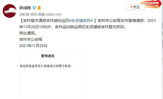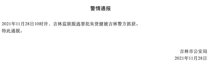 吉林市公安局发布警情通报:2021年11月28日10时许,吉林监狱脱逃罪犯朱贤健被吉林警方抓获。