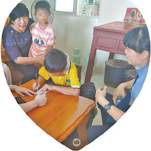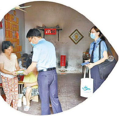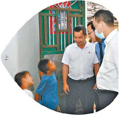图①:广东省人大代表周小萍(左一)与检察干警走访被救助儿童。