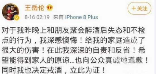 王岳伦微博发文:对于我昨晚上和朋友聚会醉酒后失态和不检点的行为,我深感懊悔!给我的家庭造成了很大伤害!在此我深深的自责和反省!希望能得到家人的原谅 也向公众真诚地道歉!同时我也决定戒酒,立此为证!