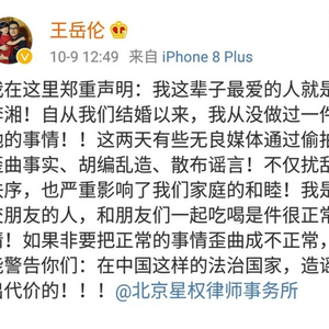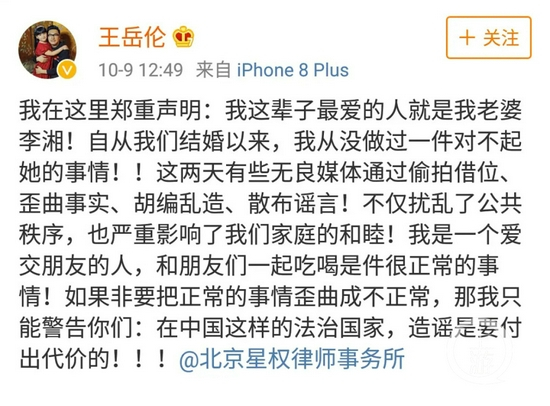 王岳伦发微博:第一次:我在这里郑重声明:我这辈子最爱的人就是我老婆李湘!自从我们结婚以来,我从没做过一件对不起她的事情!!这两天有些无良媒体通过偷拍借位、歪曲事实、胡编乱造、散布谣言!不仅扰乱了公共秩序,也严重影响了我们家庭的和睦!我是一个爱交朋友的人,和朋友们一起吃喝是件很正常的事情!如果非要把正常的事情歪曲成不正常,那我只能警告你们:在中国这样的法治国家,造谣是要付出代价的!!!