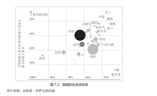 如果有人问思维缜密、见多识广的美国人,美国和中国哪个国家给社会底层10%的孩子爬到顶层10%提供了更好的机会,99%的人会眼都不眨地回答:当然是美国提供了更好的机会。然而,如图7.2所示,中国的社会流动性大于美国。