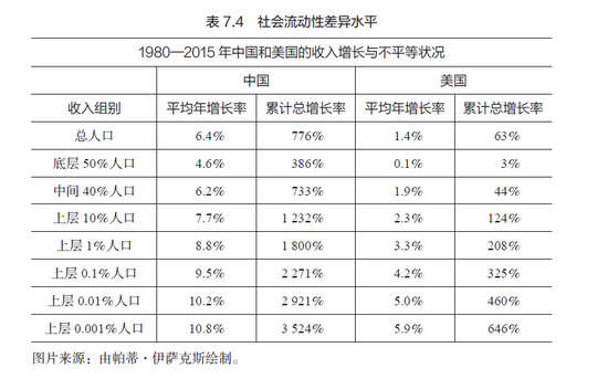 表7.4的数据来自世界不平等数据库,它也记录了在社会平等方面,中国比美国做得更好。1980—2015年,中国上层10%人口的累计总增长率为1 232%,美国为124%;但美国上层10%人口的总增长率是底层50%人口的41倍,相比之下,中国的仅为3倍多。