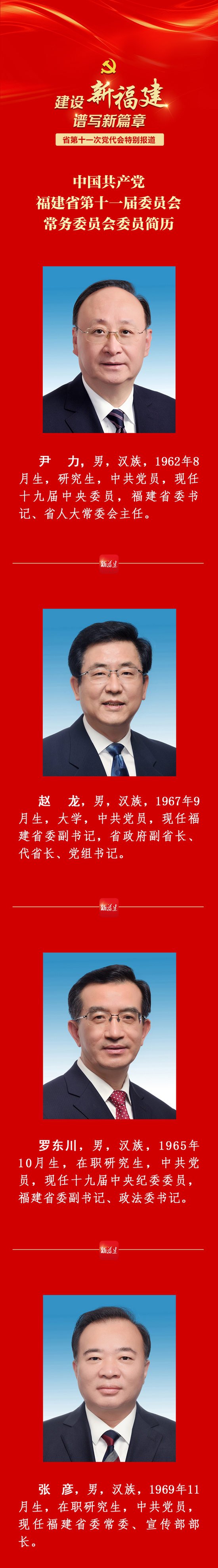 经无记名投票选举,尹力、赵龙、罗东川、张彦、李仰哲、邢善萍、林宝金、崔永辉、郭宁宁、吴偕林、宋鸿喜、王永礼、刘建洋当选为中国共产党福建省第十一届委员会常务委员会委员。