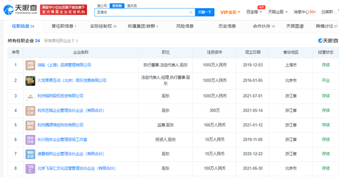 天眼查显示,王岳伦名下同样有24家公司,但大多已经注销,仅8家显示为存续或开业,王岳伦全部有持股。这些公司涉及娱乐发展、股权管理、企业管理、运营管理等诸多板块,成立时间也多在近两年。