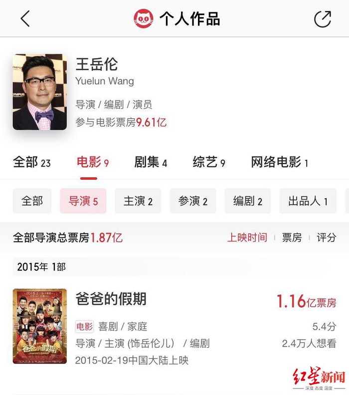 随后,王岳伦又参与了两部综艺衍生的真人秀电影。根据猫眼电影专业版,其中参演的电影《爸爸去哪儿》2014上映,收获6.96亿元票房;2015年导演的《爸爸的假期》不及前一部,票房为1.15亿。