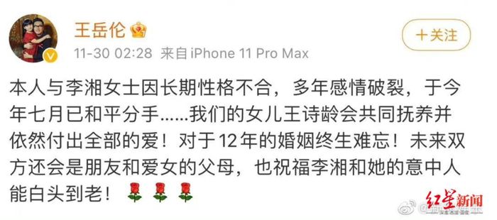 红星资本局消息,11月30日凌晨,王岳伦在微博发文宣布与李湘离婚,称二人因长期性格不合,多年感情破裂,于今年7月和平分手,女儿将共同抚养,最后还祝福李湘“和她的意中人能白头到老”。