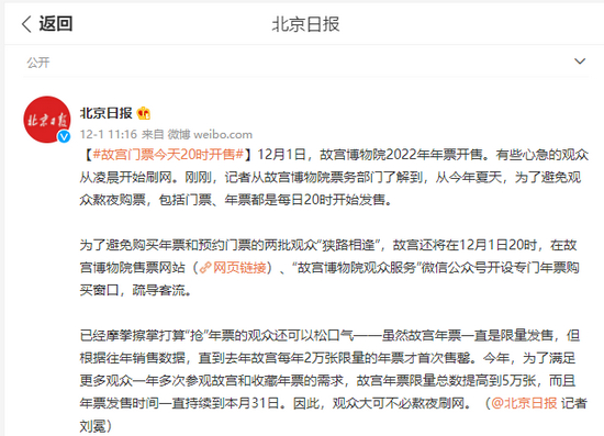 12月1日,故宫博物院2022年年票开售。有些心急的观众从凌晨开始刷网。刚刚,记者从故宫博物院票务部门了解到,从今年夏天,为了避免观众熬夜购票,包括门票、年票都是每日20时开始发售。